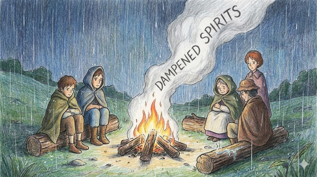 - 해석: (파생어/비유) 'Dampen(축축하게 하다)'이 동사로 쓰여, 누군가의 열정이나 사기에 물을 뿌려 우울하고 의기소침하게 만드는 것을 뜻합니다.