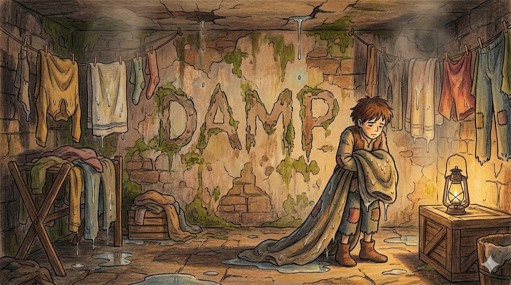 - Damp (부정적): 덜 마른 빨래, 지하실 등 눅눅하고 곰팡내 날 듯 불쾌하게 축축한 상태. (a damp towel - 덜 말라서 냄새나는 수건)