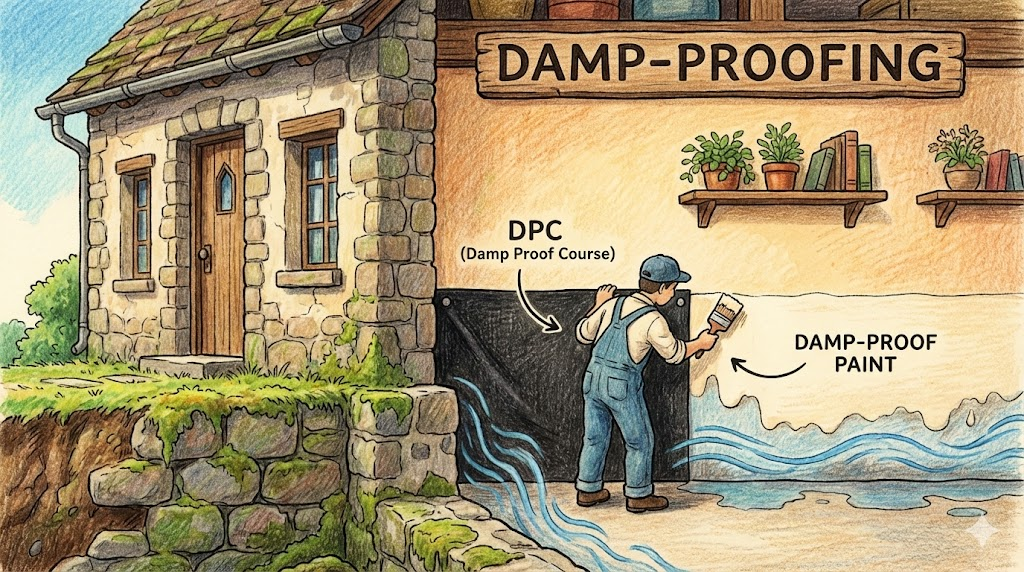 위에서 설명한 'rising damp'나 외부의 수분이 건물 내부로 침투하는 것을 막기 위해 벽이나 바닥에 특수 비닐 필름(DPC)을 깔거나, 방수 크림/페인트를 바르는 '사전 습기 차단 공사' 를 뜻합니다. 'Waterproof(방수)'가 물이 새는 것을 막는 것이라면, 'Damp-proof'는 습기가 스며드는 것을 막는 것에 초점이 맞춰져 있습니다.