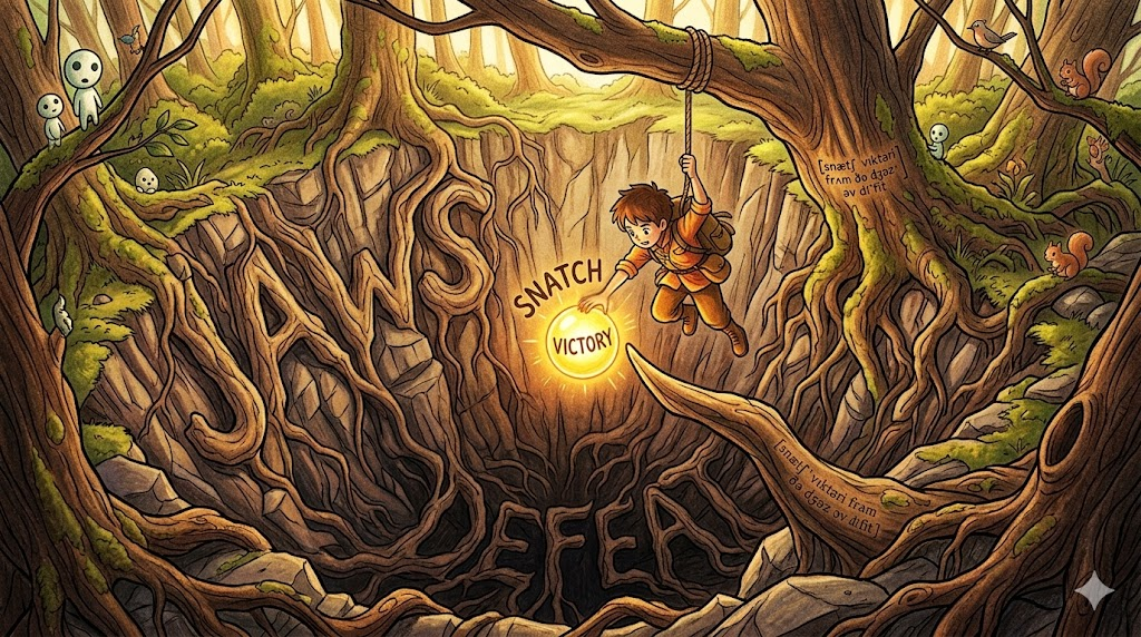 'jaws'는 맹수의 턱(아가리)을 뜻합니다. 즉, '패배(defeat)'라는 무서운 괴물의 입속에 들어가 씹혀 먹히기 직전의 절망적인 상황에서, 극적으로 '승리(victory)'를 낚아채어(snatch) 구출해 냈다는 매우 역동적이고 짜릿한 비유입니다.
