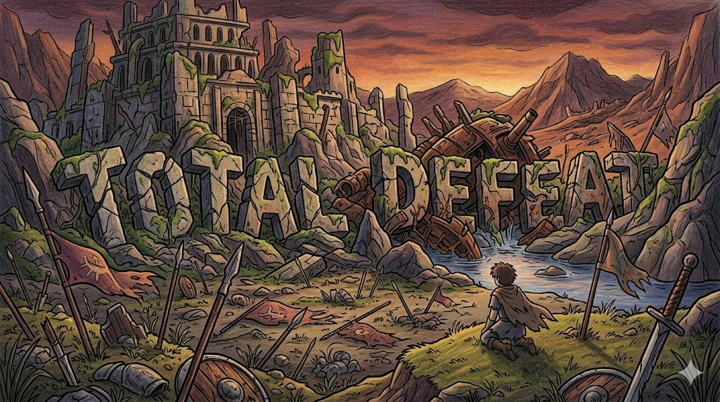 'total(전체적인, 완전한)'이 붙어, 단순히 점수 차이가 큰 것을 넘어 '모든 전략, 자원, 혹은 방어선이 완전히 무너져 항복할 수밖에 없는 상태' 를 뜻합니다. 역사적인 전쟁에서 국가가 완전히 항복하거나, 비즈니스 경쟁에서 회복 불가능할 정도로 시장에서 밀려났을 때의 무거운 분위기를 전달합니다.