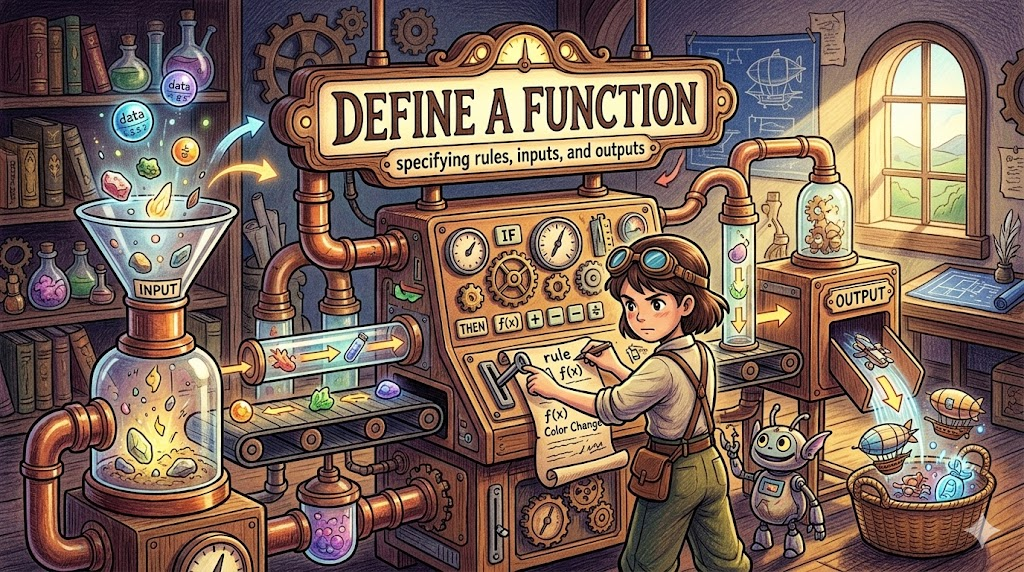 주로 수학이나 컴퓨터 과학(프로그래밍) 분야에서 쓰이는 전문적이고 기술적인 표현입니다. 프로그래밍에서 특정 작업을 수행하는 코드의 블록(함수)을 만들고, '이 함수가 어떤 입력을 받아 어떤 결과를 출력할지 그 규칙을 지정해 주는 행위' 를 의미합니다.