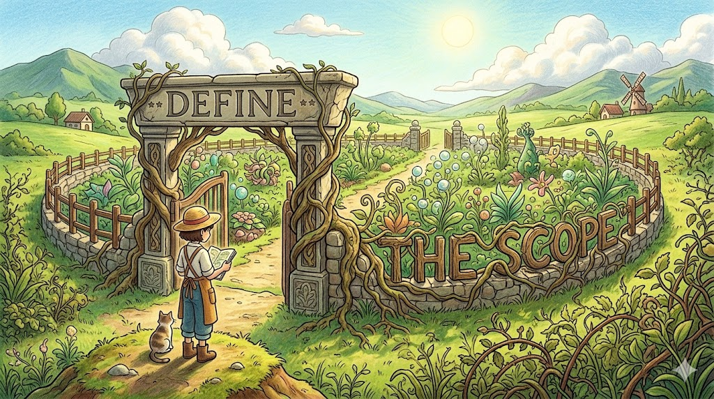 - 해석: (비즈니스/연구) 프로젝트나 조사가 어디서부터 어디까지 다룰 것인지를 정하는 것입니다.