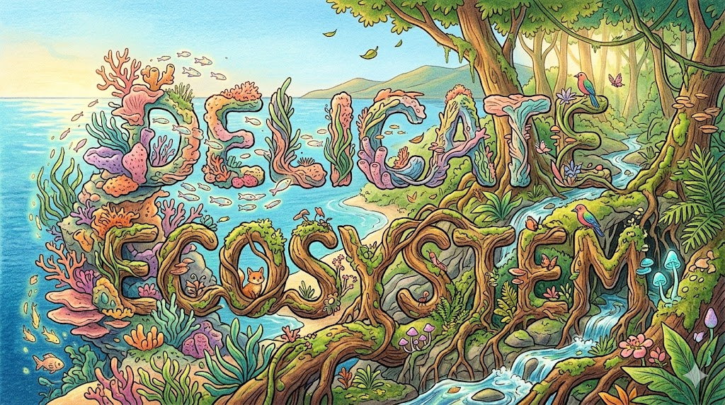 수많은 생물과 환경 요소가 아주 미묘하고 정교하게 맞물려 돌아가고 있어서, '아주 작은 외부의 변화(온도 상승, 오염, 외래종 유입 등) 하나만으로도 전체 시스템이 쉽게 파괴될 수 있는 환경' 을 뜻합니다. 산호초, 열대우림, 극지방의 환경 문제를 다루는 다큐멘터리나 뉴스 기사에서 단골로 등장하는 표현입니다.