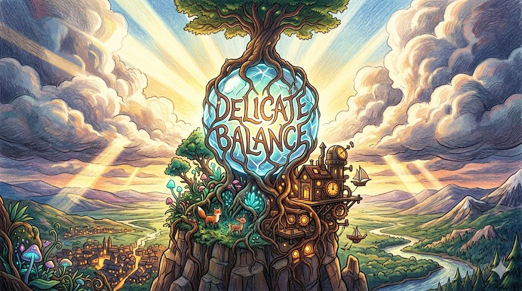 서로 상반되거나 갈등하는 힘, 이해관계, 혹은 요소들이 아슬아슬하게 평형을 유지하고 있는 상태입니다. 환경 보호와 경제 발전 사이의 균형, 복잡한 국제 외교 관계, 혹은 개인의 일과 삶의 균형(Work-life balance) 등 '한쪽으로 조금만 치우치거나 삐끗해도 큰 문제가 발생하는 절묘하고 예민한 상황' 을 아주 훌륭하게 묘사합니다.