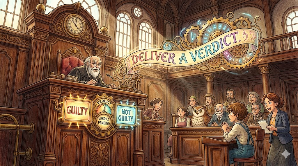 법정 용어로, 배심원단(jury)이나 판사(judge)가 긴 재판 끝에 피고인이 유죄(guilty)인지 무죄(not guilty)인지에 대한 '공식적인 최종 결정(verdict)을 발표하는 행위' 를 뜻합니다. 긴장감 넘치는 법정 드라마나 범죄 뉴스 기사에서 판결이 나오는 결정적인 순간을 묘사할 때 반드시 쓰이는 표현입니다.