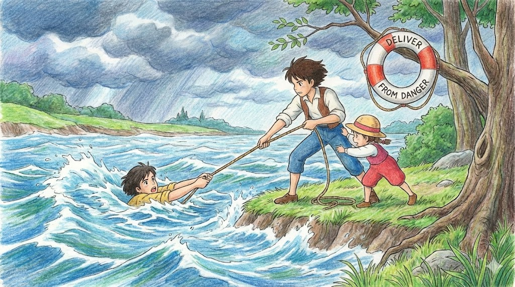 여기서 'deliver'는 물건을 배달하다가 아니라 '위험이나 악으로부터 구출하다(rescue, save)' 라는 아주 무겁고 고전적인 뜻으로 쓰였습니다. 기독교의 주기도문(The Lord's Prayer)에 등장하는 "우리를 시험에 들게 하지 마시옵고, 다만 악에서 구하시옵소서(deliver us from evil)"라는 구절에서 유래하여, 종교적, 문학적, 혹은 영화 제목 등으로 매우 유명한 표현입니다.