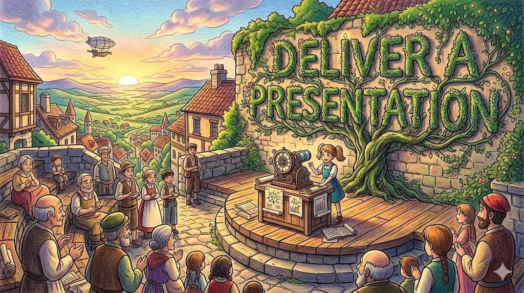 - 해석: 시각 자료와 함께 정보를 청중에게 공식적으로 전달하고 발표하는 것입니다. 'give a presentation'보다 조금 더 격식 있는 표현입니다.