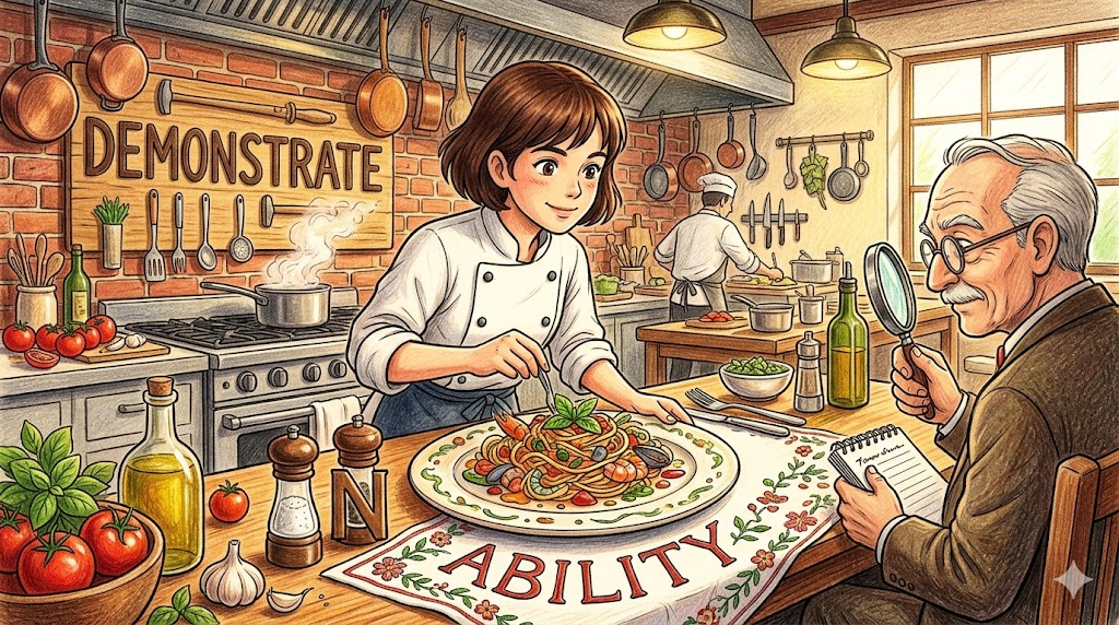 - 해석: (비즈니스/면접) 자신이 가진 기술이나 잠재력을 실제 성과나 행동을 통해 증명해 보이는 것입니다.