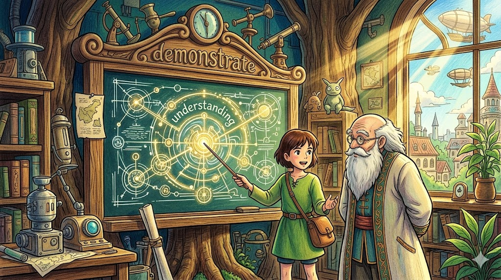 - demonstrate understanding: 배운 내용을 정확히 적용하거나 설명하여 학업적/실무적 '이해도를 보여주다' 입니다.