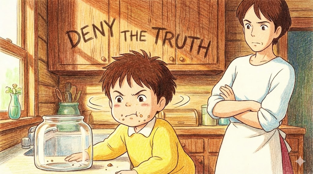 눈앞에 뻔히 보이는 사실이나 상황이 너무 고통스럽거나 받아들이기 힘들어서 '그것이 사실이 아니라고 스스로를 속이거나 외면하는 상태' 를 뜻합니다. 심리학적으로 '부정(denial)'의 단계에 머물러 있는 모습이나, 객관적인 사실을 무시하고 고집을 피우는 사람을 묘사할 때 자주 씁니다.